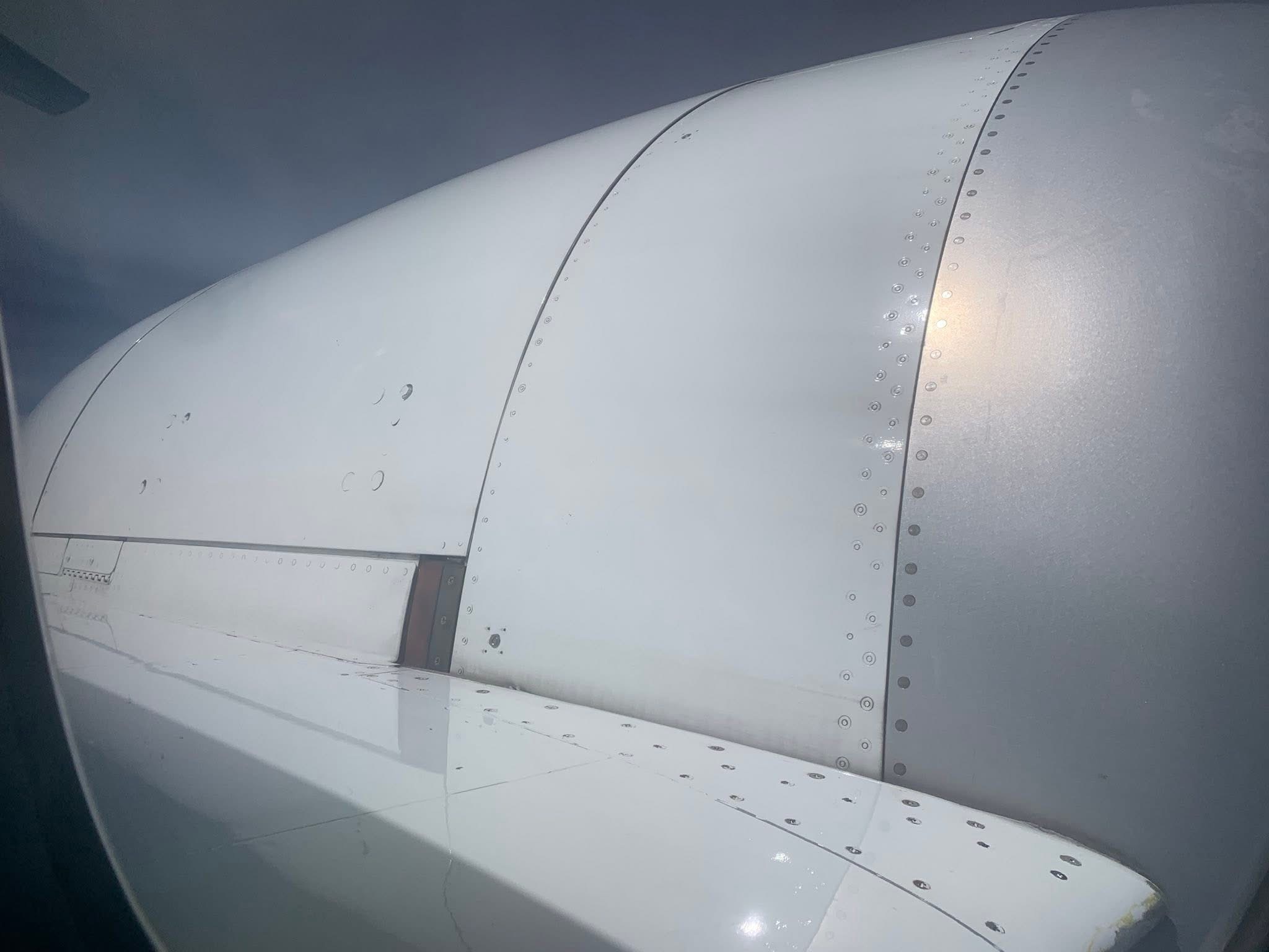 Non siamo lontani dal motore, anzi lo abbiamo a fianco, la visibilita’ del finestrino e’ parziale, ma si vede la engine nacelle.
