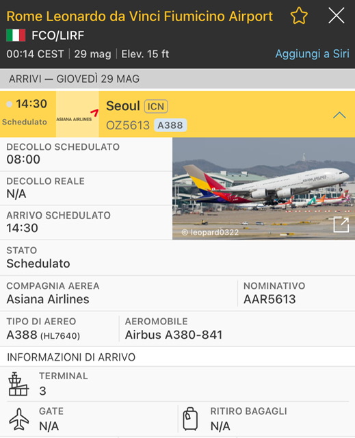 Unica data, oggi la compagnia aerea coreana Asiana Airlines opera un volo spot tra Seoul Incheon e Roma Fiumicino con l’Airbus 380-800.
