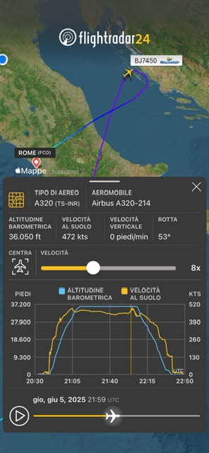 Poi dopo aver richiesto l’inversione verso Roma Fiumicino per l’atterraggio allo scalo italiano, l’aereo ha dichiarato “PAN PAN all’ATC. L’aereo A320-214 TS-INR era a FL360 alle 23:58 quando ha iniziato la virata e alle 00:11del 6 giugno ha inserito 7700, il codice per una emergenza generale che si inserisce sul transponder dell’aereo.