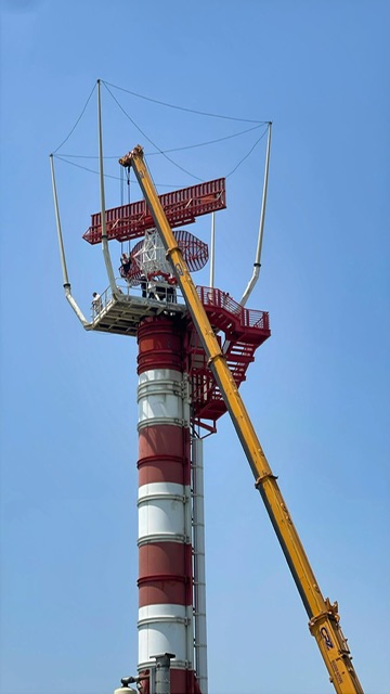 Nell’immagine di Giorgio Adamo, il radar fermo con i tecnici al lavoro e la complessità dell’operazione, che ha coinvolto una gru con un lungo braccio per operare sul gruppo antenna.