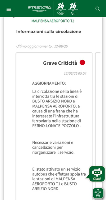 Una frana da questa notte interessa la linea ferroviaria che collega Busto Arsizio con l’aeroporto di Milano Malpensa T1 come si legge sulla pagina internet di Trenord.