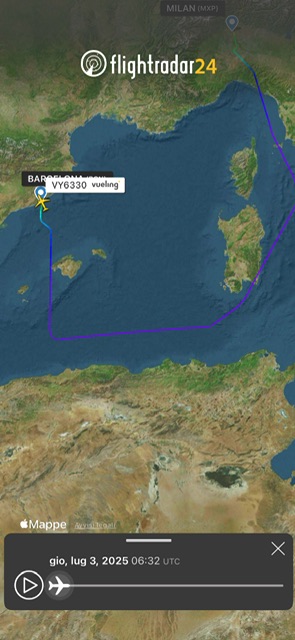 Tra le assurdità di questi giorni, il modo nel quale si deve operare per garantire i voli percorrendo centinaia di chilometri in più rispetto al solito é l’esempio di questo volo Vueling, che per percorre un tragitto di poco più di un ora tra Barcellona e Milano Malpensa.