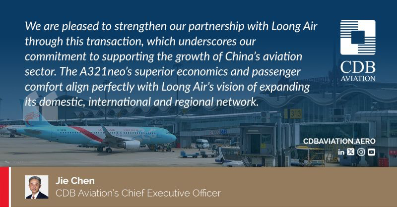 CDB Aviation, una sussidiaria irlandese interamente controllata da China Development Bank Financial Leasing Co., Ltd. (“CDB Leasing”), ha annunciato la stipula di nuovi contratti di leasing per sei Airbus A321neo con il suo cliente cinese, Zhejiang Loong Airlines Co., Ltd. (“Loong Air”).