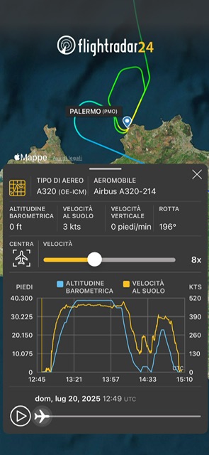 L’aereo ha poi posato le ruote a Catania alle 15:03UTC ovvero alle 17:03 locali. Alle 19:26 e’ poi atterrato a Palermo dopo il volo di riposizionamento. Il decollo per Lione e’ stato alle 20:32 anziche’ le 16:50.