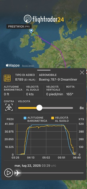 Dal 19 luglio é stato fermo a Roma Fiumicino al rientro da La Romana il B787-9 EI-NUA poi il 22 luglio e’ volato a Prestwick in Scozia.