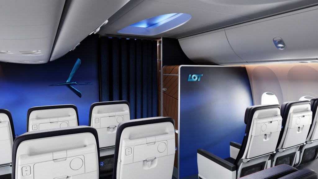 I nuovi sedili R2 annunciati per la flotta di B737-MAX8 e Regional Jet saranno dotati di rivestimenti in vera pelle blu LOT e del logo della compagnia aerea ricamato su una piccola cucitura dello schienale. Le caratteristiche di comfort includono un poggiatesta regolabile in 6 direzioni e un’inclinazione di 10 cm per il B737-MAX8, cuscini comfort, supporti BYOD e porte USB-C ad alta potenza Astronics.