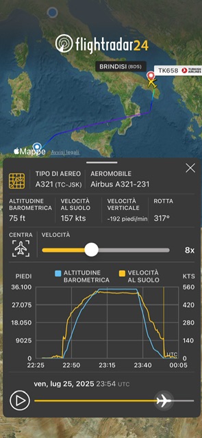 Il velivolo, un Airbus 321-200 con marche TC-JSK era decollato da Tunisi alle 23:43 quasi in perfetto orario, visto che l’ora di partenza era le 23:35. Poi é entrato nello spazio aereo italiano sorvolando il Canale di Sicilia e il Mar Tirreno, come si vede da diagramma di volo lasciando la Sicilia sulla destra. Quindi ha tagliato la Calabria. La quota di crociera di FL350 era stata raggiunta alle 1:09 italiane al traverso di Palermo. All’1:35 dopo aver lasciato la costa ionica dal crotonese ha iniziato a scendere e allo stesso tempo ha virato a sinistra dirigendosi verso Brindisi dove l’aereo é atterrato.