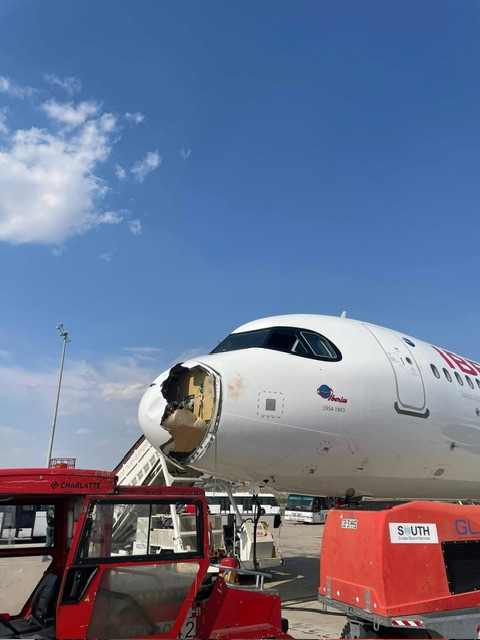 Oggi un Airbus 321neoXLR della compagnia aerea spagnola Iberia ha subito un bird strike formato da uccelli che hanno creato questi danneggiamenti al radome radar e ad uno dei due motori.