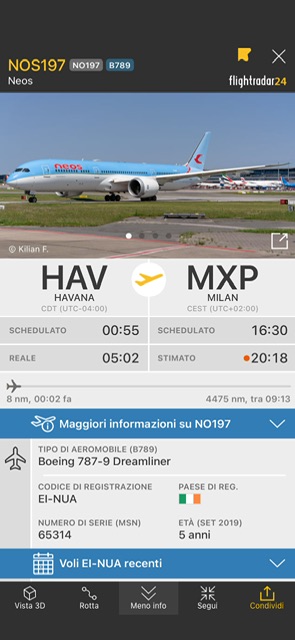 C’é da segnalare a livello statistico e storico, che Il 4 agosto lo stesso aereo Boeing 787-9 Neos EI-NUA era rientrato a Milano Malpensa da Prestwick. Presso l’aeroporto scozzese aveva effettuato attività manutentive non programmate. Il velivolo era stato inviato in Scozia il 22 luglio partendo da Roma Fiumicino , dove era fermo dal 19 luglio dopo il suo rientro da La Romana come NO523.