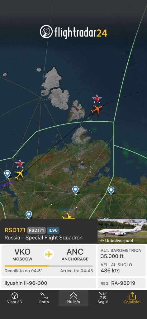 Dopo l’Ilyushin 96-300 del Russia Special Flight Squadron arrivato in Alaska nella base aerea di Elmendorf della US Air Force, adesso ci sono altri due aerei dello stesso tipo che stanno volando sulla Transiberiana da Mosca Vnukovo ad Anchorage. In uno dei due ci dovrebbe essere il Presidente Russo Vladimir Putin, che domani nel giorno di Ferragosto incontrerà il Presidente USA Donald J Trump.
