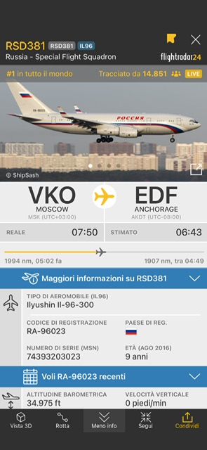 Questo Ilyushin 96-300 russo del Russia Special Flight Squadron é in volo da oltre 5 ore e tra meno di altre 5 raggiungerà l’Alaska. A bordo ci sarà Vladimir Putin che va ad incontrare Donald J Trump? Tra poche ore ne avremo conferma nel nostro pomeriggio inoltrato.