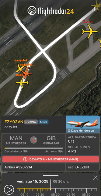 Il volo per Gibilterra, la U22253 e’ partita alle 10:53 con A320-214 G-EZUT con un aereo fermo a Manchester.