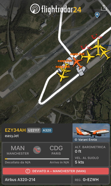 L’aereo che ha fatto la U22117 per Parigi CDG e’ stato l’A320-214 G-EZTG decollato cinque ore dopo alle 11:14. Anche questo é stato reperito tra quelli fermi a Manchester.