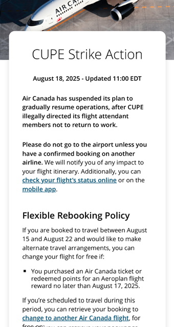 Nella comunicazione inviata ai passeggeri , Air Canada scrive che lo sciopero di CUPE-Canadian Union of Public Employees é illegale. Air Canada offre la flessibilità di modificare i voli ai propri passeggeri che sono stati interessati dall’astensione e che possono partire in futuro quando i voli saranno ristabiliti. Oppure chi vuole cancellare i propri viaggi se si tratta di segmebti comprati con la formula della impossibilità di rimborso, questi danari verranno trasformati in somme di denaro da utilizzare per prossimi acquisto. Ovviamente, seguendo la facoltà data dalla legislazione non rimborsa o paga direttamente spese di soggiorno. É diverso per chi é in Europa dove per effetto della legislazione vigente deve provvedere a compensare i passeggeri che non possono volare salvo riprotezioni con altri voli, che a quanto pare nom trova i vettori che accolgano i viaggiatori con ticket AC.