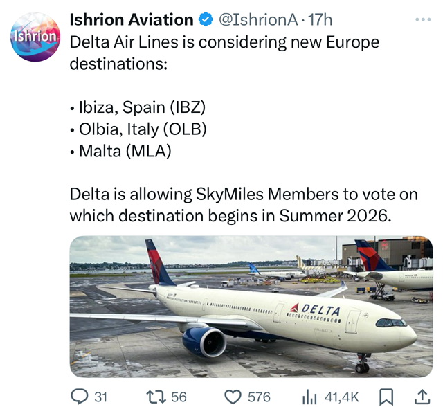 A confermare che sarà Olbia una delle papabili destinazioni, per altro per noi gia’ scelte perché non é un sondaggio di facciata a sancire la scelta circa il rischio finanziario industriale di una nuova destinazione. Ishrion Aviation sul social X indica Olbia, Sardinia – poi Malta e Ibiza Spain