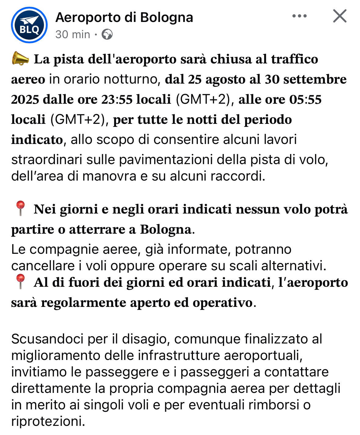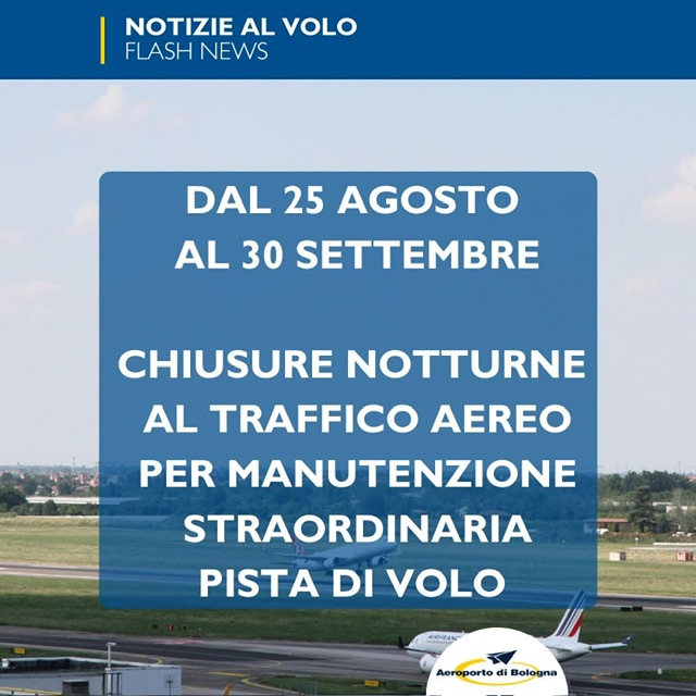 L’Aeroporto di Bologna dal 25 agosto 2025 al 30 settembre 2025 sarà chiuso per lavori alla pista di volo dalle 23:55 alle 05:55 di ogni notte nelle cinque settimane di attività di rifacimento di una porzione di pista sul lato 12 e della taxiway dopo il raccordo Bravo. Nell’altra restante parte della giornata dalle 5:55 alle 23:55 é sempre aperto a tutto il traffico commerciale.