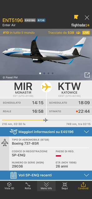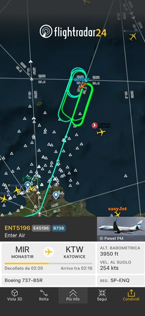 Questa sera il volo ENT5196 da Monastir a Katowice dell’aerolinea leisure polacca Enter Air dopo essere decollato dall’aeroporto tunisino ha fermato la salita a FL100 e poi é disceso a FL090, quindi a nord di Palermo si é messo in holding a 4000 piedi e sta compiendo lunghi circuiti di attesa.
