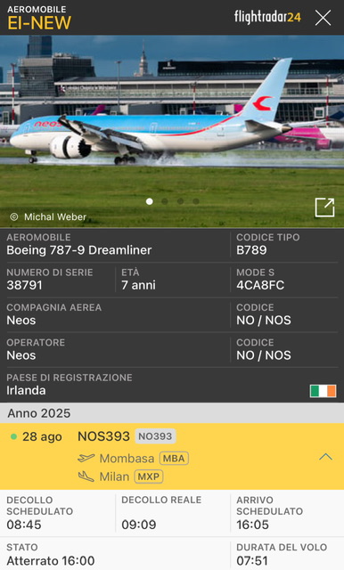 C’é da segnalare che questo aereo, un Boeing 787-9 EI-NEW é fermo a Milano Malpensa da poco più di due giorni.