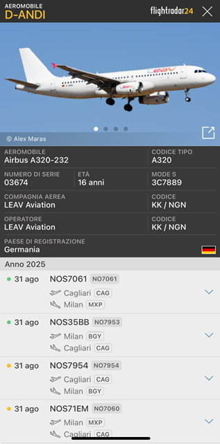 L’aereo é giunto ferry flight il 28 agosto 2025 da Varsavia a Milano Malpensa come NO8920.