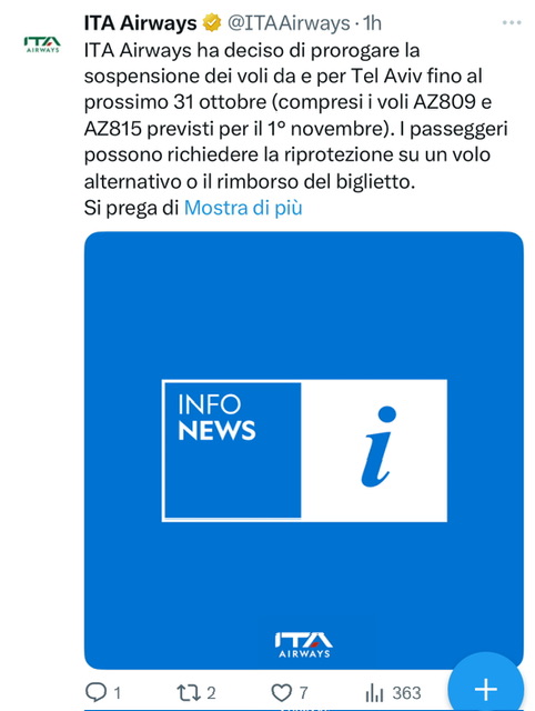 Questa mattina sul social X.com la compagnia aerea ITA Airways comunica la decisione di continuare a non volare su Tel Aviv da Roma Fiumicino fino a fine ottobre. Anche l’1 novembre 2025 sui voli AZ809 e AZ815.