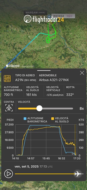 Poco dopo ci riprova alle 19:05 uscendo dalla holding e la velocità molto alta. Dopo aver nuovamente iniziato l’avvicinamento con l’aereo A321neo 9H-WIN. L’atterraggio avviene con alta velocita. 161 nodi a 700 piedi e configurazione clean.