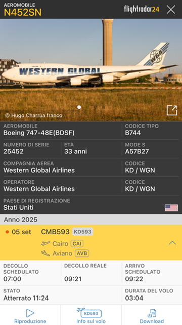 Quello giunto ieri mattina ad Aviano e’ un Boeing 747-48E BDSF, un aereo cargo della Western Global Airlines molto raro a vedersi a queste latitudini.
