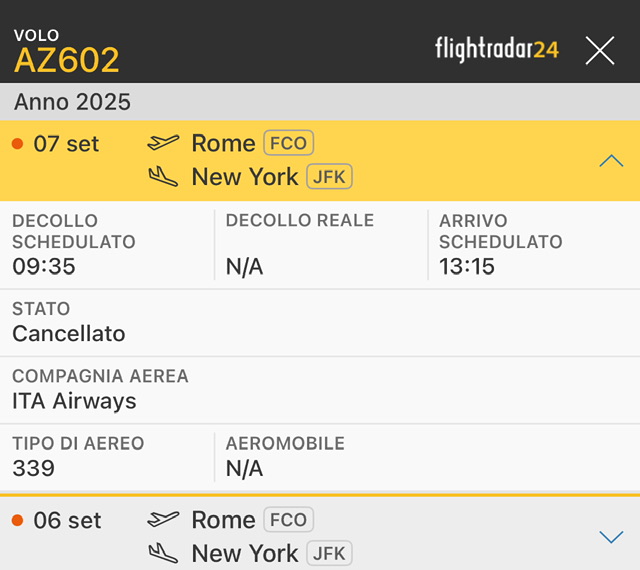Quest’oggi si nota la cancellazione del volo AZ602 da Roma Fiumicino per New York JFK previsto in partenza alle 9:35 previsto con A330-900neo.