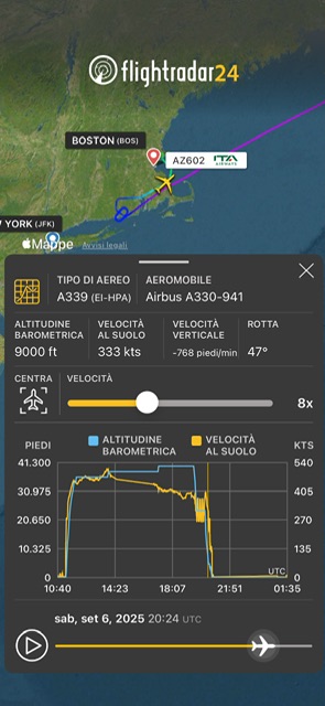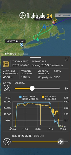 La United UA41 decollato alle 11:23 da Roma Fiumicino alle 11:41, quando arrivato sul Rhode Island ha brevemente orbitatp su due punti distinti ed e’ poi atterrato a Boston. L’aereo un B787-9 N26967 e’ ancora a Boston.