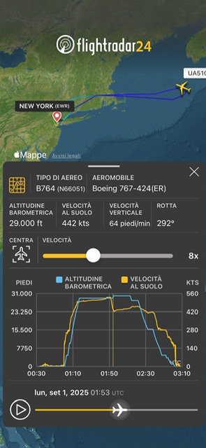 Il 31 agosto il Boeing 767-424ER N66051 e’ decollato alle 21:00 anziche alle 20:15 da Newark e dopo essere stato prima autorizzato a 5000 piedi e poi a 10000 piedi. Quindi a FL290 che ha raggiunto alle 21:18 ora di New York. A quasi un ora dal decollo alle 21:51 ha virato a sinistra rientrando verso New York e salendo a FL300. Alle 22:12 è sceso a FL280 e 9 minuti piu’ tardi e’ sceso a FL160. Poi per 5000 piedi ed e’ atterrato alle 23:02 locali a 2 ore e 2 minuti dal decollo. La mattina dopo l’aeromobile e’ ripartito per San Juan de Puerto Rico alle 8:14. Cancellato il volo UA509 del 1 settembre da Roma Fiumicino a New York Newark.