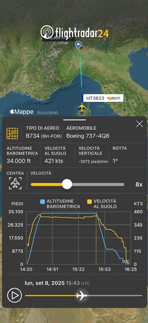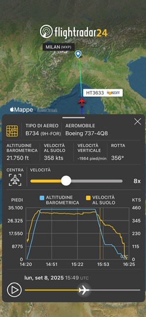Il volo HT3633 era decollato da Djerba in Tunisia alle 15:21 locali con destinazione Milano Malpensa. Secondo i grafici di Flightradar24.com l’aereo ha lasciato la quota di crociera di FL340 alle 15:43UTC, sei minuti dopo ha inserito il codice 7700 sul transponder. L’aereo si trovava sul Mar Ligure e ha raggiunto FL100 ancor prima di raggiungere la costa ligure ed e’ stato indirizzato dall’ATC fino alla pista 35L alle 18:19.