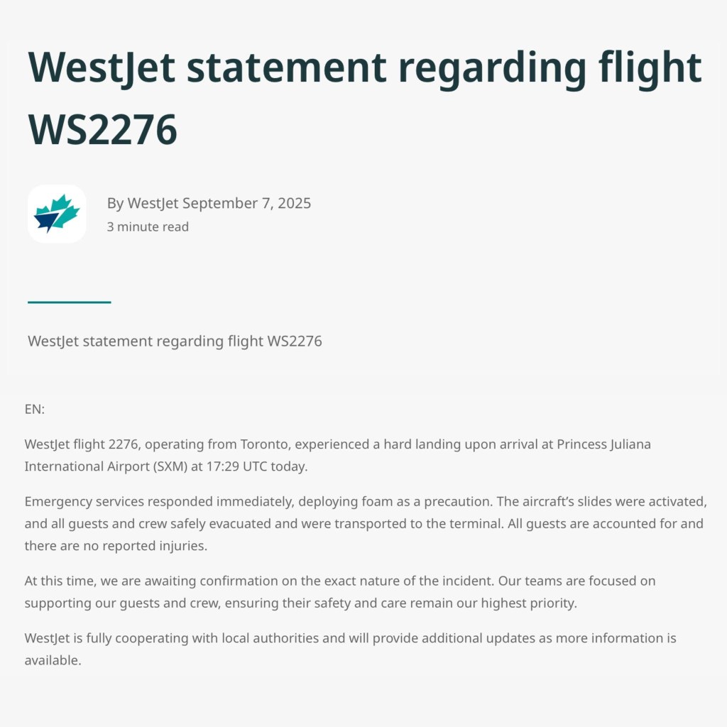 La compagnia aerea canadese conferma l’atterraggio pesante a St.Marteen e le condizioni e supporto a passeggeri ed equipaggio.