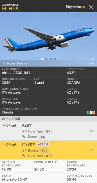 Il 6 settembre l’aereo come AZ8011 e’ stato trasferito da Boston a New York JFK partendo alle 20:02 ed e’ atterrato alle 20:47.
