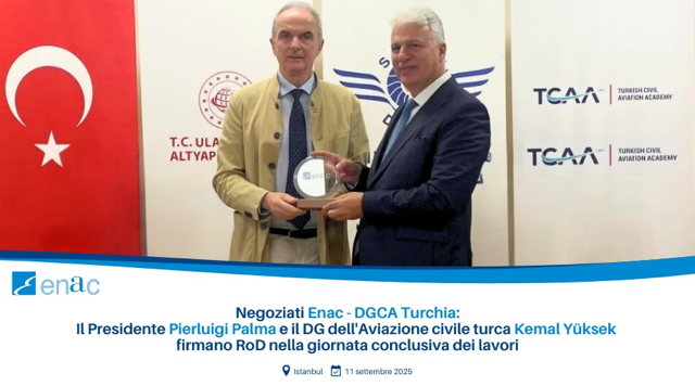 Giornata conclusiva dei negoziati tra Enac e l’Aviazione civile della Turchia a Istanbul dove oggi, 11 settembre, il Presidente Enac Pierluigi Di Palma e il DG dell’Aviazione civile turca Kemal Yüksek hanno condiviso il nuovo accordo bilaterale del 2014, da sottoporre all’approvazione del Parlamento della Turchia e, nel mentre, sottoscritto un Record of Discussion tra le due Autorità, che promuove il rafforzamento delle relazioni aeronautiche.