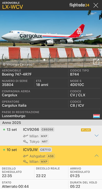 L’aeromobile e’ arrivato alle 00:;44 da Ashgabat come C87113. E’ ripartito oggi alle 16:24 per Tokyo come C89266. Nel mentre , nelle oltre 60 ore di sosta ha subito un intervento tecnico dove ha sostituito uno dei quattro motori.