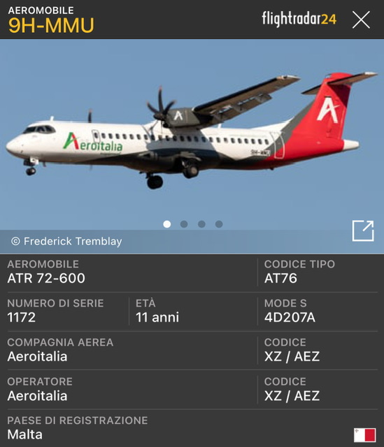 Aeroitalia vola verso Parma da Roma Fiumicino con ATR72-600 9H-MMU. La Lazio gioca contro il Sassuolo.