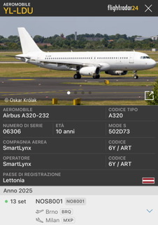 Oggi da Brno a Milano Malpensa é arrivato un A320-200 in ACMI da SmartLynx con marche YL-LDU come NO/NOS8001. Questo aereo era in nolo alla AirArabia e RoyalAirMaroc fino a mercoledi scorso