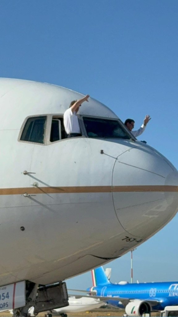 I due piloti che salutano dai rispettivi finestrini del cockpit del Boeing 767-400ER United Airlines, celebrano il “say good bye” per quest’anno del volo New York Newark – Palermo – New York Newark. I risultati sono stati in linea con le previsioni e ci sarà anche il prossimo anno, pare trisettimanale.