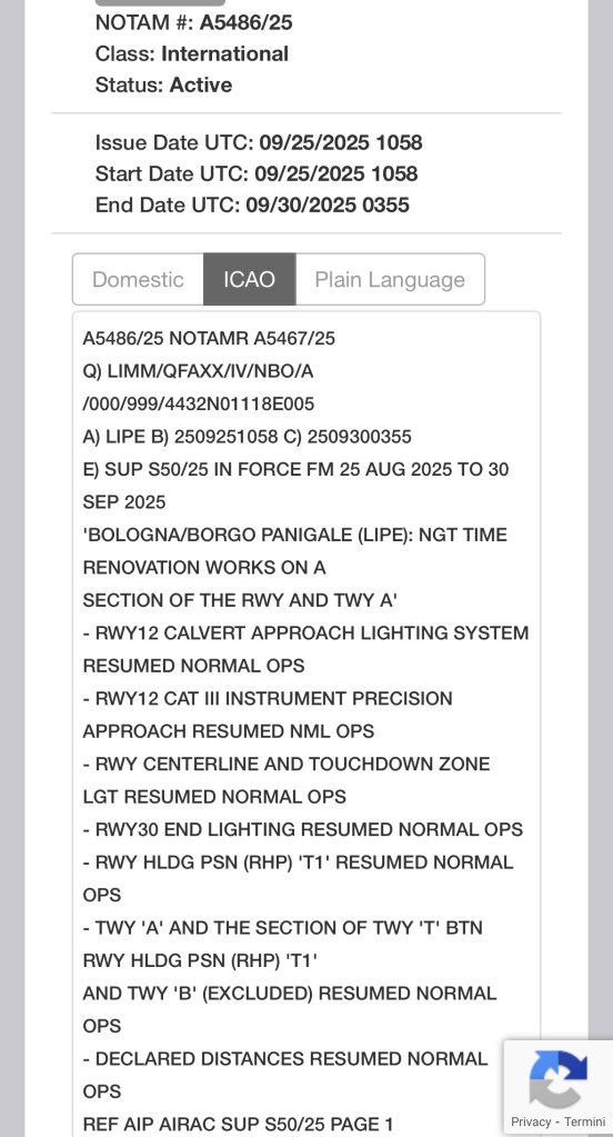 Con l’emissione del NOTAM A05486/25 alle 10:58Z del 25-9-2025 a Bologna sono terminate tutte le attività di rifacimento della parte di pista lato 12 tra il raccordo Bravo e l’inizio. Oltre al raccordo Alfa. I lavori erano iniziati il 25 agosto alle 23:55.
