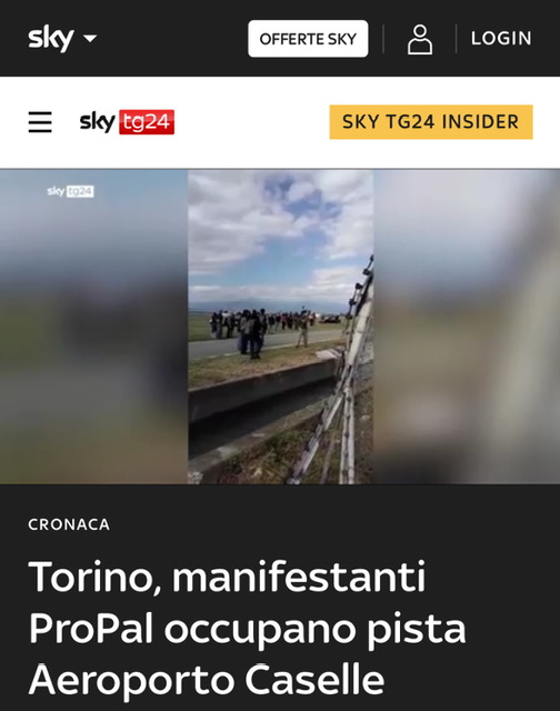 Tra le 14 e le 15 all’aeroporto di Torino dei dimostranti ProPal sono entrati tagliando una recinzione e sono entrati nel sedime aeroportuale. L’attività di volo e’ stata bloccata e due voli sono atterrati a Cuneo e Milano Malpensa. Brevi immagini al link