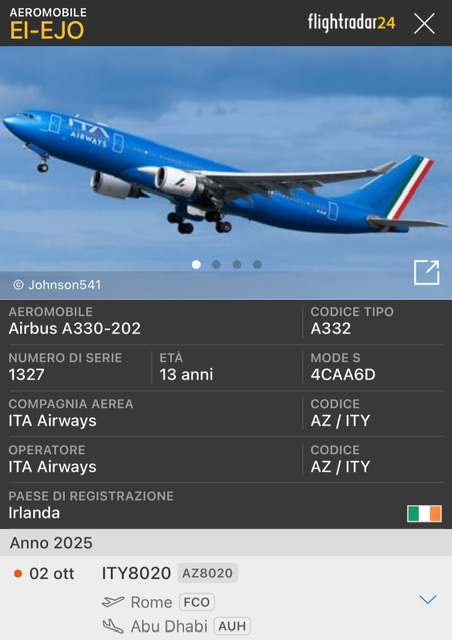 Questo Airbus 330-200 ITA Airways con marche EI-EJO da qualche giorno e’ negli Emirati Arabi Uniti.