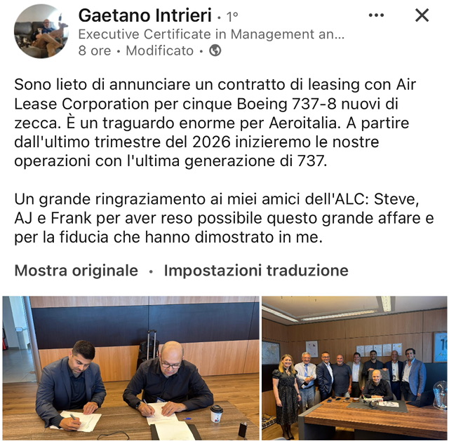 L’annuncio e’ stato fatto dal CEO di Aeroitalia Gaetano Intrieri sul suo profilo Linkedin. Il fatto costituisce una importante milestone per la compagnia aerea italiana.