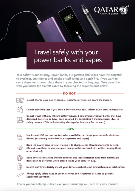 Anche Qatar Airways segue Il “vento da est” creato dall’incidente di inizio anno ad Air Busan quando andò a fuoco un power bank stivato in un bagaglio in una cappelliera di un A321 poi dichiarato inutilizzabile. Ora anche Qatar Airways blocca l’utilizzo e ne limita dove trasportarli.