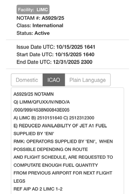 Dal 15 ottobre 2025 e fino alle 24 dell’ultimo giorno dell’anno a Milano Malpensa c’e’ scarsità di carburante a causa di una minore produzione da parte di una raffineria ENI. Un NOTAM – Notice To Airmen e’ stato emesso per avvisare le compagnie aeree di questo problema e si consiglia di arrivare con piu‘ carburante a bordo per arrivare a destinazione con il successivo volo.