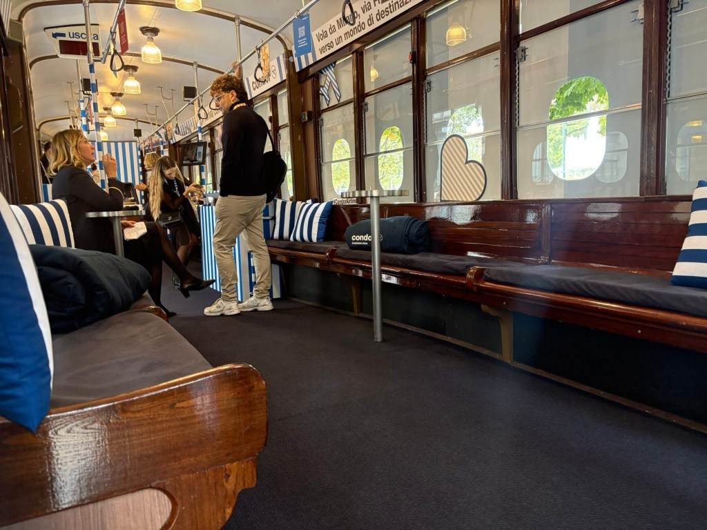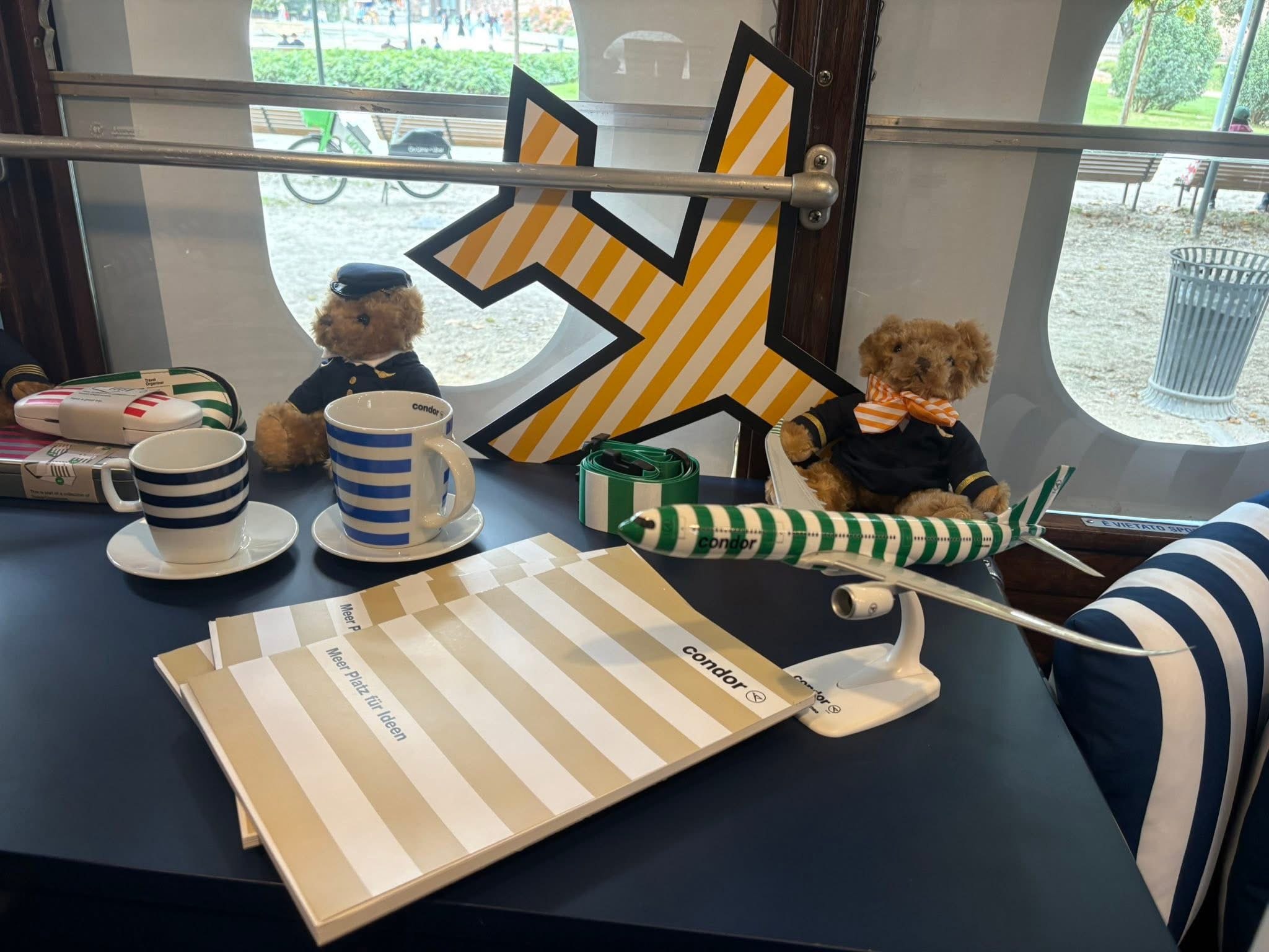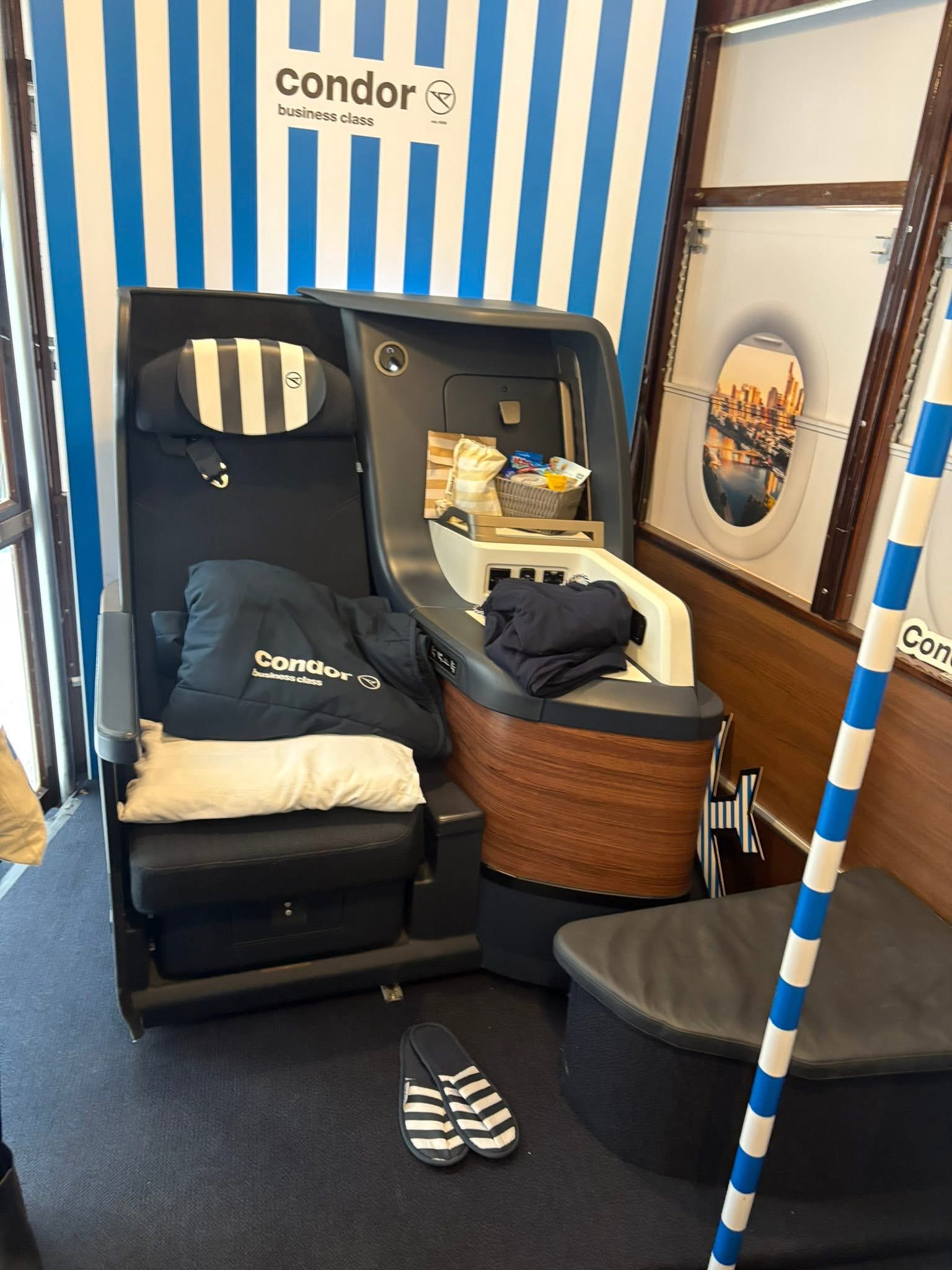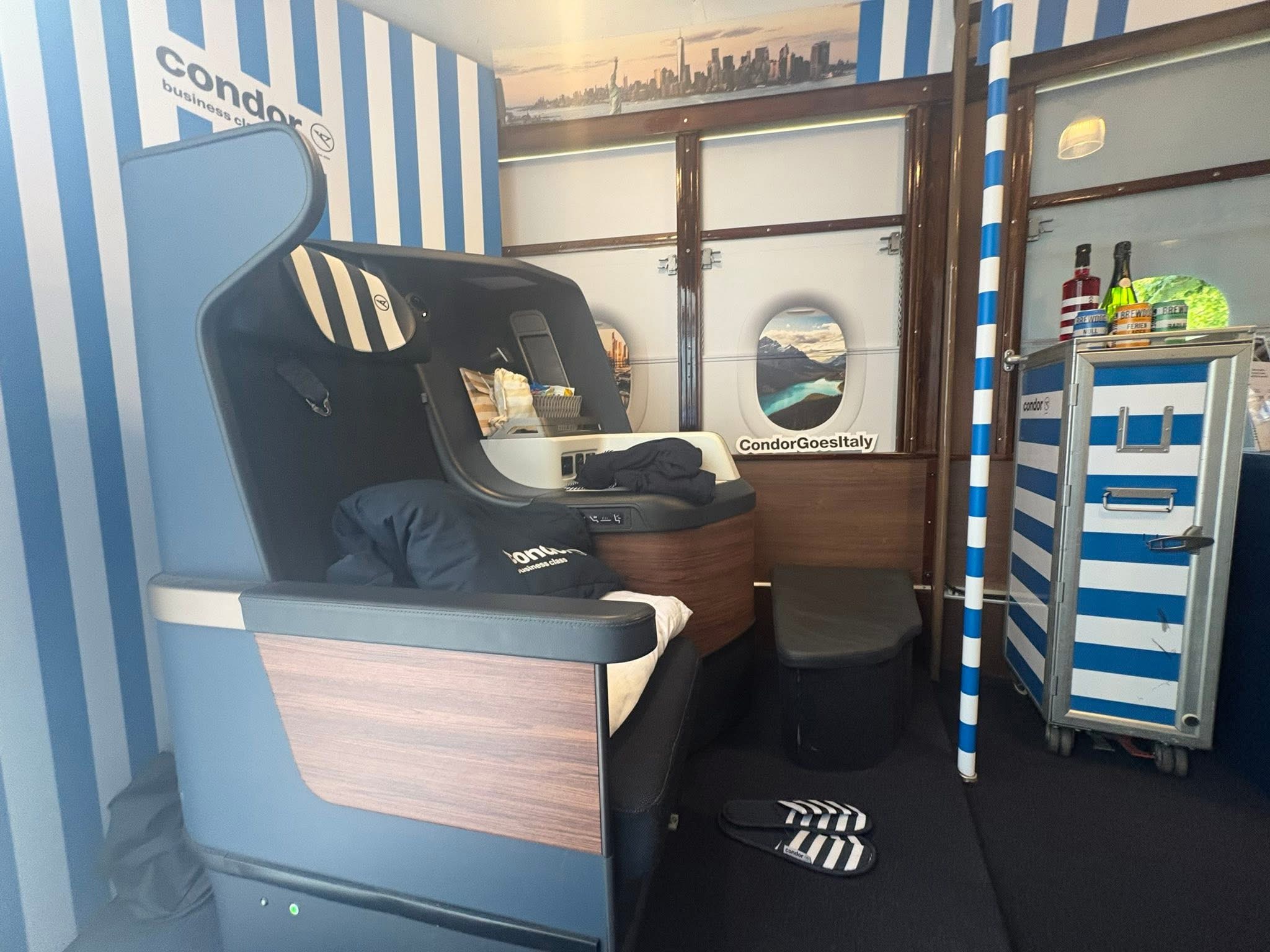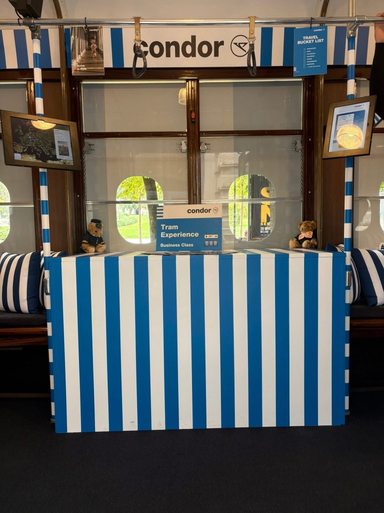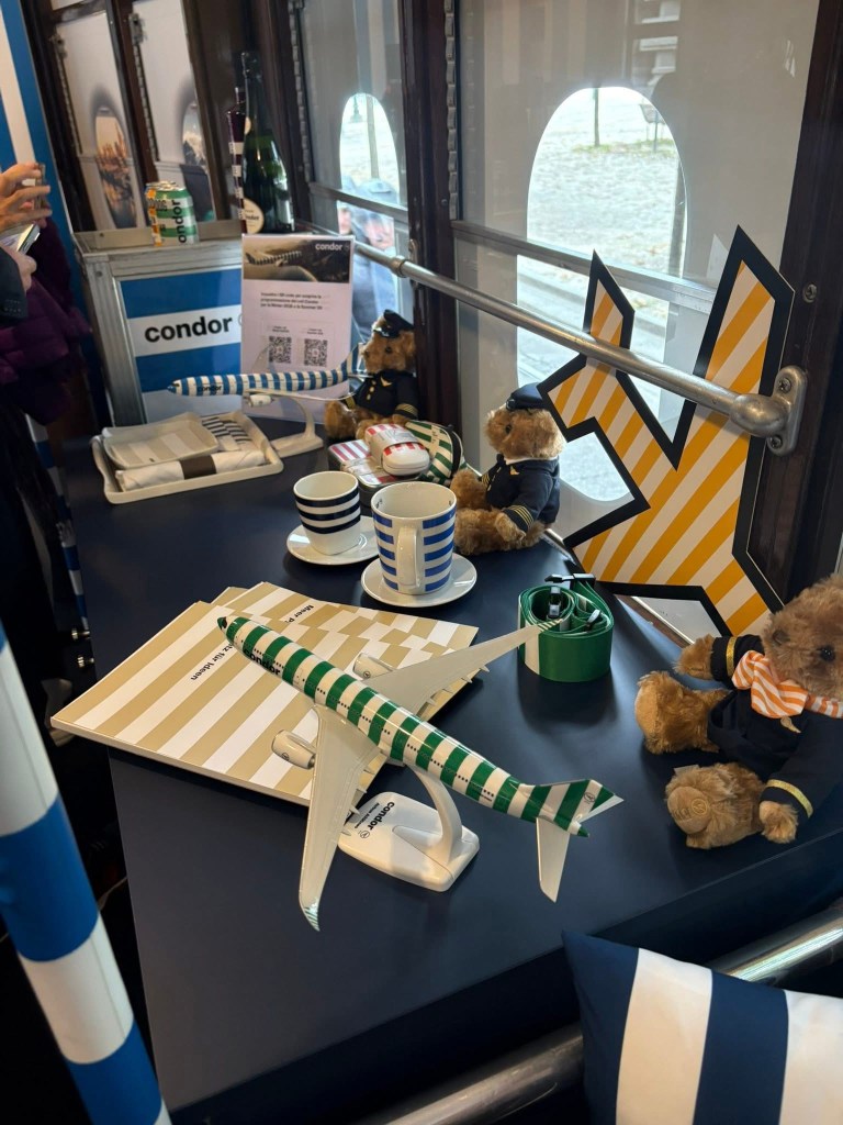 All’interno del tram storico e’ stato ricreato l’ambiente della cabina di un aereo Condor. Tutto dal pavimento in su. Infatti sono stati stesi gli stessi tappeti blu che ci sono a bordo degli A320 o A330-900neo. I cuscini sulle panche in legno utilizzano gli stessi tessuti delle poltrone dell’aereo. Poi c’e’ il servizio di bordo. Last and not least c’e’ anche un mock up di una poltrona di business class completamente lie flat dell’A330-900neo. L’aereo da lungo raggio che in 18 esemplari collega Cabo San Lucas, Anchorage Las Vegas, Antigua, Mauritius, Phuket oppure Cape Town.