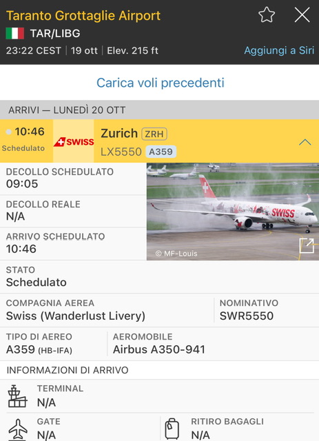 Il volo LX5550 partirà domani mattina da Zurigo alle 9:05 e l’arrivo e’ previsto alle 10:46.