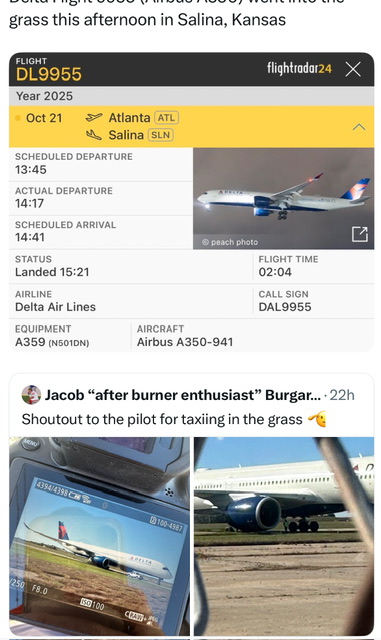 Nella giornata di ieri, un Airbus 350-900 Delta con marche N501DN partito da Atlanta e atterrato a Salina nel Kansas é andato nel prato durante il rullaggio verso l’apron.
