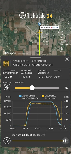 L’aereo e’ decollato alle 14:17 da Atlanta ed e’ arrivato alle 15:21 a Salina. Due ore e quattro minuti e’ stato il tempo di volo. Il codice DL9955 e’ un codice utilizzato per voli di trasferimento. il velivolo N501DN e’ stato il primo ad essere consegnato alla compagnia aerea americana.