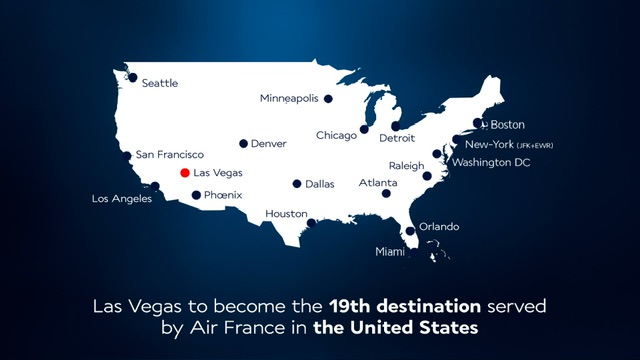 Las Vegas diventerà la 19ª destinazione di Air France negli Stati Uniti e la 26ª in Nord America, insieme ad Atlanta, Boston, Cancun, Chicago, Dallas, Denver, Detroit, Houston, Los Angeles, Città del Messico, Miami, Montreal, Minneapolis, New York JFK, New York Newark, Orlando, Ottawa, Phoenix, Quebec City, Raleigh-Durham, San Francisco, Toronto, Seattle, Vancouver e Washington D.C.
