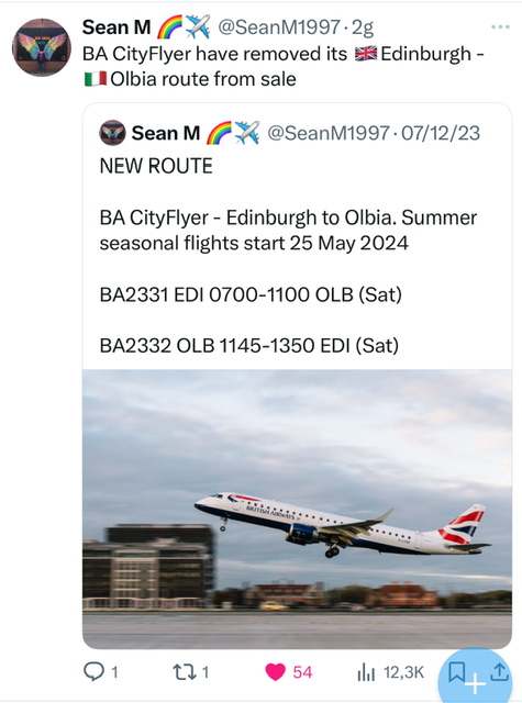 Ci viene segnalato da SeanM1987 su X che la rotta Edimburgo-Olbia di BA Cityflyer e’ stata rimossa dalle vendite per l’estate 2026. La rotta era un volo settimanale con Embraer E190 operata ogni sabato