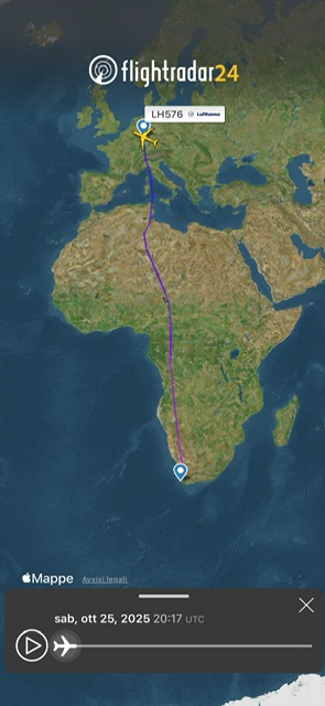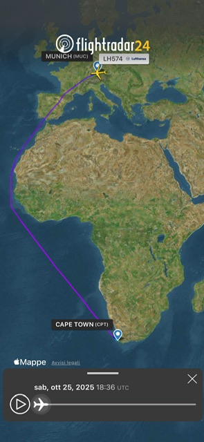 Stessa sera, ma fanno rotte diverse i voli Lufthansa dalla Germania a Cape Town. Il volo da Monaco ha circumnavigato la costa del continente e invece il volo da Francoforte ha percorso presso una linea retta. Pareva di essere ritornati ai tempi dell’apartheid quando SAA-South African Airways volava lontana dall’Africa. Oppure faceva scalo a Ilha do Sal a Capo Verde e gli equipaggi si trovavano all’Hotel Belorizonte. La differenza sono state 2 ore di volo in più. Perché?